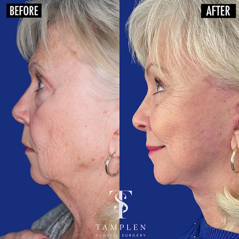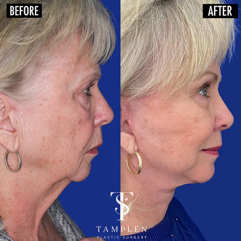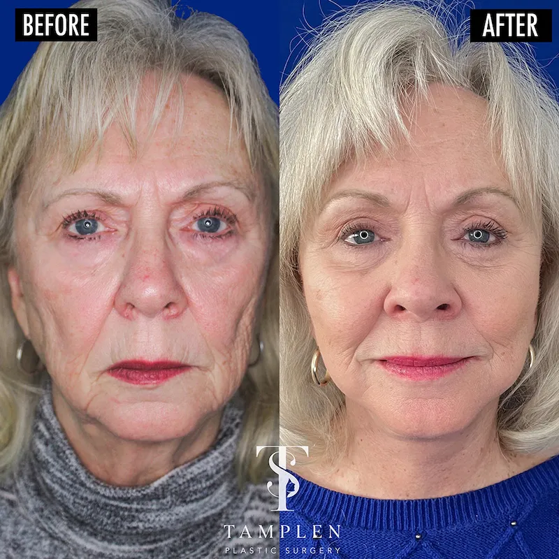 Loving these results 3 months after endoscopic #browlift, upper and lower #blepharoplasty, and #facelift. She looks natural and refreshed with a beautiful new neck line - she now looks as young as she feels! Facial aging results in soft tissue in the upper face to fall down to the jowls over time - this creates an upside triangle shape highlighted in the second photo. Following surgery, the “triangle of youth” and fullness in her face has been restored & she is happier than ever 🙌🏻